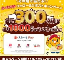 X (Twitter)キャンペーンフォロー&RTで合計300名に『えらべるPay 最大で1000円分』がその場で当たる!2025年10月【カーネクスト・X(Twitter)キャンペーン】 どんな車でも買い取るというオンライン中古車買取サービスを展開している【カーネクスト】の公式X (Twitter)アカウントで「秋が来た~!カーネクストキャンペーン」が開始しています。 2025年10月13日(月)までのキャンペーン期間...2025/10/02 [18:41]X (Twitter)キャンペーンプレゼント・懸賞大量当選(100名以上)毎日応募可能