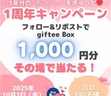 X (Twitter)キャンペーンフォロー&RTで390名に『giftee Box 1000円分』がその場で当たる!2025年10月【京葉銀行・X(Twitter)キャンペーン】 千葉県を中心に店舗を展開している地方銀行の【京葉銀行 けいようぎんこう】の公式X (Twitter)アカウントで「アカウント開設1周年記念 フォロー&リポストキャンペーン」が開始しています。 2025年10月3日(金)までのキャンペー...2025/10/02 [7:20]X (Twitter)キャンペーンプレゼント・懸賞初回のみ応募可能大量当選(100名以上)