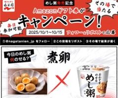 X (Twitter)キャンペーンフォロー&RTで1000名に『Amazonギフト券 500円分』がその場で当たる! 【永谷園・X(Twitter)キャンペーン】 お茶漬けなどの販売で有名な【永谷園】の公式X (Twitter)アカウントで「平日毎日参加できる!めし粥発売記念キャンペーン」が開始しています。 2025年10月15日(水)までのキャンペーン期間中に、公式X (Twitter)アカウント...2025/10/02 [7:10]X (Twitter)キャンペーンプレゼント・懸賞大量当選(1000名以上)毎日応募可能