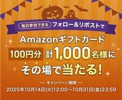 X (Twitter)キャンペーンフォロー&RTで1000名に『Amazonギフト券 100円分』がその場で当たる!2025年10月【クレディセゾン・X(Twitter)キャンペーン】 セゾンカードを発行しているクレジットカード会社の【クレディセゾン】公式X (Twitter)アカウントで「毎日参加できる!フォロー&リポストでその場で当たる!Xキャンペーン」が開始しています。 2025年10月31日(金)までの期間内...2025/10/15 [6:10]X (Twitter)キャンペーンプレゼント・懸賞大量当選(1000名以上)毎日応募可能