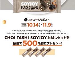 X (Twitter)キャンペーンフォロー&RTで500名に『SOYJOY 黒ゴマ 4本セット』が当たる!2025年10月~11月【大塚製薬・X(Twitter)キャンペーン】 大塚製薬が販売している固形状の栄養食品の【SOYJOY (ソイジョイ)】の公式X (Twitter)アカウントで「フォロー&リポスト CHOI TASHI SOYJOYキャンペーン」が実施中です。 2025年11月9日(日)までのキ...2025/10/15 [7:00]X (Twitter)キャンペーンプレゼント・懸賞初回のみ応募可能大量当選(100名以上)