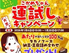 納豆や豆腐などの販売で有名な【タカノフーズ】の公式LINEアカウントで「おみくじで占う新春の運勢!こかめちゃん運試しキャンペーン」が実施中です。2026年1月20日(火)17時までのキャンペーン期間内に、LINE友だちに追加をした上でトーク...
