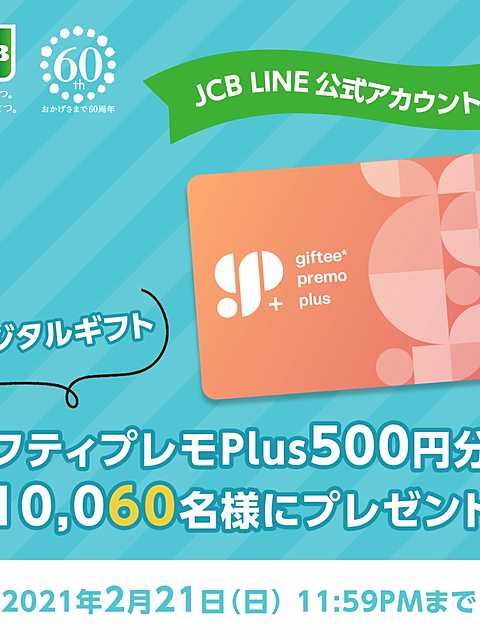 2021年2月21日(日)12時までのキャンペーン期間中に、JCB公式LINEアカウントを友達に追加して、トーク画面に送られてきたバナーまたは下部メニューから応募先にをして抽選をすると、その場で10,060名に『ギフティプレモPlus 500円分』が当たる、プレゼントキャンペーンとなっています。