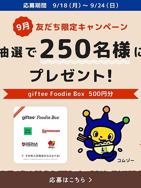 2023年9月24日(日)までのキャンペーン期間内に、公式アカウントを友だちに追加をして、トーク画面に来るバナーからアンケートに回答をして応募をすると、後日抽選で250名に『giftee Foodie Box 500円分』が当たる、プレゼントキャンペーンとなっています。
