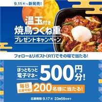 2025年9月17日(水)までのキャンペーン期間内に、公式アカウントをフォローした上で、期間中に毎日投稿される対象ポストをリポストすると、その場で抽選で200名に『ほっともっと 電子マネー 500円分』が当たる、プレゼントキャンペーンとなっています。