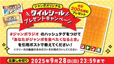 2025年9月28日(日)までのキャンペーン期間内に、公式アカウントをフォローした上で、期間中に投稿される対象ポストにハッシュタグ【#ジャンボラジオ】を付けてジャンボを食べたくなるときを記入して引用ポストすると、後日抽選で200名に『板ジャンボオリジナル タイルシール』が当たる、プレゼントキャンペーンとなっています。