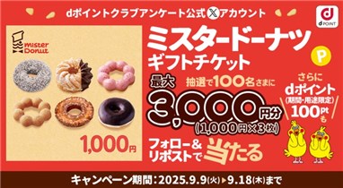 フォロー&RTで100名に『ミスタードーナツギフトチケット 最大3000円分+dポイント100P』が当たる!2025年9月【dポイントクラブアンケート・X(Twitter)キャンペーン】