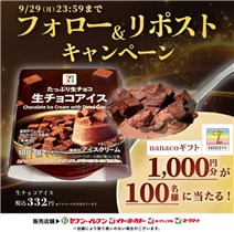 2025年9月29日(月)までの期間中に、公式アカウントをフォローして、キャンペーン期間中に投稿される対象ポストをリポストすると、後日抽選で100名に『nanacoギフト 1,000円分』が当たる、プレゼントキャンペーンとなっています。