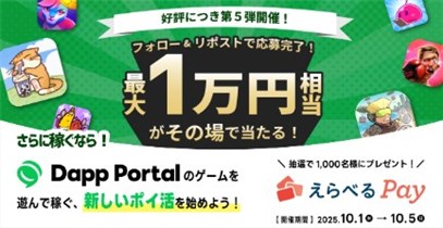 LINEのNFTポータルサイトの【Dapp Portal】の公式X (Twitter)アカウントで「えらべるPay 1万円分抽選キャンペーン【2025年10月】」が開始しています。