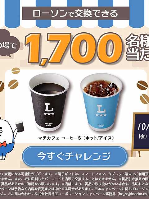 2025年10月31日(金)までのキャンペーン期間内に、長谷工グループLINEトーク画面↓のメニュー画面から、アンケートの画面に移動をしてアンケートに回答後に応募画面から応募をすると、その場で抽選で1,700名に『マチカフェコーヒーS ローソン無料引換券』が当たる、プレゼントキャンペーンとなっています。