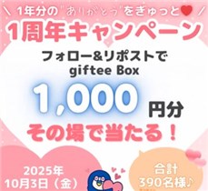 2025年10月3日(金)までのキャンペーン期間内に、公式アカウントをフォローして、キャンペーン対象ポストをリポストして対象ポストのURLから応募するとその場で抽選で390名に『giftee Box 1,000円分』が当たる、プレゼントキャンペーンとなっています。