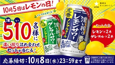 飲料の販売で有名な【サッポロビール】の公式X (Twitter)アカウントで「10月5日はレモンの日!510名様に濃い搾り詰め合わせセットが当たるキャンペーン」が開始しています。