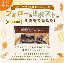 2025年10月12日(日)までのキャンペーン期間中に、公式アカウントをフォローして、キャンペーン期間中に毎日投稿される対象ポストをリポストすると、その場で抽選で300名に『セブンカフェ カカオ香るくちどけ濃厚ガトーショコラ セブンイレブン無料引換券』が当たる、プレゼントキャンペーンとなっています。