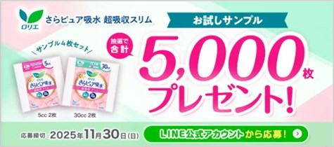 2025年11月30日(日)までのキャンペーン期間内に、公式LINEアカウントを友だちに追加をして、トーク画面からアンケートに回答をすると、後日抽選で合計1,250名に『さらピュア吸水 超吸収スリム サンプル4枚セット』が当たる、プレゼントキャンペーンとなっています。