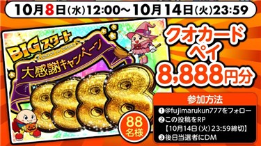 2025年10月14日(火)までのキャンペーン期間内に、公式アカウントをフォローした上で、キャンペーン対象ポストをリポストすると、後日抽選で88名に『QUOカードPay 8,888円分』が当たる、プレゼントキャンペーンとなっています。