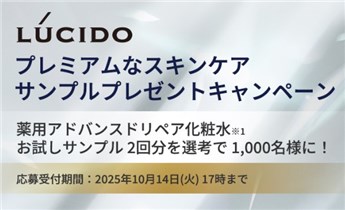 2025年10月14日(火)17時までのキャンペーン期間内に、特設ページの応募フォームからアンケートに回答をすると、後日抽選で1,000名に『ルシード 薬用アドバンスドリペア化粧水 サンプル 2回分』が当たる、プレゼントキャンペーンとなっています。