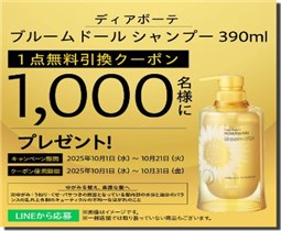 2025年10月21日(火)までのキャンペーン期間内に、LINE友だちに追加をしてトーク画面下部のメニューをタップしてバナーの応募先から、サンドラッグ会員番号を入力して応募をすると、その場で抽選で1,000名に『ディアボーテ ブルームドールシャンプー 390ml 無料引換券 無料引換券』が当たる、プレゼントキャンペーンとなっています。