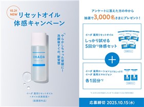 2025年10月15日(水)までのキャンペーン期間内に、公式アカウントをフォローした上で、対象ポストのURLから資生堂オンラインストアに登録をしていない人は登録をして、アンケートに回答をすると、後日抽選で3,000名に『イハダ 薬用リセットオイル5回分 + +薬用ローション・薬用エマルジョン各1回分サンプル』が当たる、プレゼントキャンペーンとなっています。
