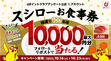 2025年10月23日(木)までのキャンペーン期間内に、公式アカウントをフォローした上で、期間中に投稿される対象ポストをリポストすると、後日抽選で100名に『スシローお食事券 最大で10,000円分 + dポイント100ポイント』が当たる、プレゼントキャンペーンとなっています。