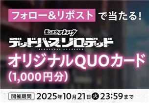 2025年10月21日(火)までの期間中に、公式アカウントをフォローして、キャンペーン対象ポストをリポストすると、後日抽選で100名に『オリジナル QUOカード 1,000円分』が当たる、プレゼントキャンペーンとなっています。