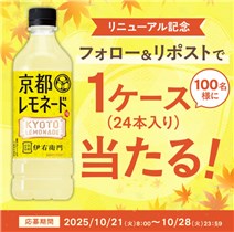 2025年10月28日(火)までのキャンペーン期間内に、伊右衛門アカウントをフォローした上で、期間中に投稿される対象ポストをリポストすると、後日抽選で100名に『サントリー 伊右衛門京都レモネード 525ml 1ケース (24本)』が当たる、プレゼントキャンペーンとなっています。