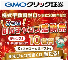 証券会社の【GMOクリック証券】の公式X (Twitter)アカウントで「GMOクリック証券 株式手数料ゼロ&20周年記念キャンペーン」が開始しています。