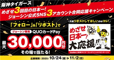 2025年11月2日(日)までの期間内に、公式アカウントをフォローした上で、期間中に、キャンペーン対象ポストをリポストして、対象ポストのURLから応募をすると、その場で抽選で合計568名に『ジョーシン専用QUOカードPay 500円分 ~ 30,000円分』が当たる、プレゼントキャンペーンとなっています。