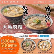 うどんチェーン店の【丸亀製麺】の公式X (Twitter)アカウントで「鴨ねぎうどん牡蠣たまあんかけ TVCM フォロー&リポストキャンペーン」が実施中です。