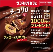 2025年11月9日(日)までの期間中に、公式アカウントをフォローして、対象ポストをリポストすると、後日抽選で100名に『サンマルクカフェ eGiftカフェチケット 1,000円分』が当たる、プレゼントキャンペーンとなっています。