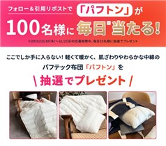 2025年11月2日(日)までのキャンペーン期間中に、公式アカウントをフォローして、キャンペーン期間中に毎日投稿される対象ポストに4の内1つを選んで【A:軽くて暖かい】【B:水に強い】【C:洗える】【D:コンパクトになる】記入をして引用ポストすると、後日抽選で100名に『パフテック布団 パフトン』が当たる、プレゼントキャンペーンとなっています。