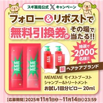 2025年11月14日(金)までのキャンペーン期間内に、公式アカウントをフォローした上で、期間中に毎日投稿される対象ポストをリポストして、対象ポストのURLから応募をすると、その場で抽選で2,000名に『スギ薬局 MEMEME モイストブーストシャンプー&トリートメントお試し1回分ピロー20ml 無料引換券』が当たる、プレゼントキャンペーンとなっています。