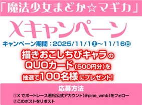 2025年11月16日(日)までのキャンペーン期間内に、公式アカウントをフォローした上で、対象ポストをリポストすると、後日抽選で100名に『魔法少女まどか☆マギカ コラボQUOカード 500円分』が当たる、プレゼントキャンペーンとなっています。