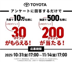 自動車の製造・販売で有名な【TOYOTA (トヨタ自動車)】の公式LINEアカウントでLINEアカウントで「TOYOTA アンケートキャンペーン」が実施中です。