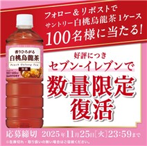 2025年11月25日(火)までのキャンペーン期間内に、公式アカウントをフォローした上で、期間中に投稿される対象ポストをリポストすると、後日抽選で100名に『サントリー白桃烏龍茶 1ケース』が当たる、プレゼントキャンペーンとなっています。