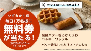 2025年11月16日(日)までの期間中に、ローソン公式アカウントをフォローして、毎日投稿される対象ポストをリポストすると、その場で抽選で毎日10,000名・期間中合計50,000名にその場で『発酵バター香るさくふわベルギーワッフル・バター香るしっとりフィナンシェ 無料引換券』が当たる、プレゼントキャンペーンとなっています。