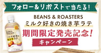 2025年11月16日(日)までのキャンペーン期間中に、公式アカウントをフォローして、キャンペーン対象ポストをリポストすると、後日抽選で100名に『UCC BEANS & ROASTERS ミルク好きの焼き芋ラテ 1ケース』が当たる、プレゼントキャンペーンとなっています。