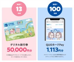 2025年11月26日(木)17時までのキャンペーン期間内に、公式アカウントをフォローした上で、期間中に投稿される対象ポストをリポストすると、後日抽選で合計113名に『QUOカードPay 1,113円分 or デジタル旅行券 50,000円分』が当たる、プレゼントキャンペーンとなっています。