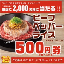 2025年11月24日(月)までのキャンペーン期間内に、公式アカウントをフォローして、対象ポストをリポストして、対象ポストの画像のURLから応募をすると、後日抽選で2,000名に『ビーフペッパーライス 500円で食べれる券』が当たる、プレゼントキャンペーンとなっています。