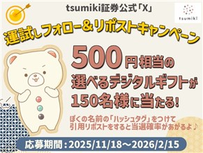 証券会社の【tsumiki証券】の公式X (Twitter)アカウントで「tsumiki証券 公式X フォロー&リポストキャンペーン 第1弾」が開始しています。