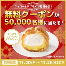 2025年11月26日(水)までのキャンペーン期間中に、公式X (Twitter)アカウントをフォローして、毎日投稿される対象ポストにハッシュタグ【ファミマから早めのプレゼント】を付けてリプライをして、対象ポストのURLから応募をすると、その場で抽選で50,000名に『たっぷりクリームのダブルシュー 無料引換券』が当たる、プレゼントキャンペーンとなっています。