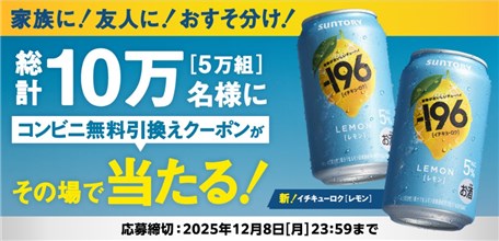2025年12月8日(月)までのキャンペーン期間中に、特設ページへアクセスをしてLINEログインをして、簡単なアンケートに答えて応募をすると、その場で抽選で50,000名に『-196 イチキューロク〈レモン〉コンビニ無料引換券 2枚』が当たる、プレゼントキャンペーンとなっています。