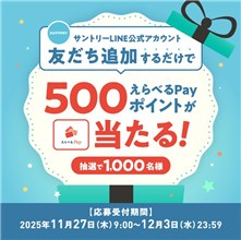 2025年12月3日(水)までのキャンペーン期間内に、LINE友だちに追加をすると、後日抽選で1,000名に『えらべるPay 500円分』が当たる、プレゼントキャンペーンとなっています。