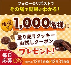 2025年12月31日(水)までの期間中に、公式アカウントをフォローして、毎日投稿される対象ポストをリポストして、対象ポストの画像のURLから応募をすると、その場で抽選で毎日1,000名にその場で『ステラおばさんのクッキーの店舗で使える、量り売りご購入の際、お好きなクッキー1枚とお引き換えいただけるデジタルクーポン』が当たる、プレゼントキャンペーンとなっています。