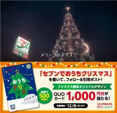 2025年12月8日(月)までの期間中に、公式アカウントをフォローして、キャンペーン期間中に投稿される対象ポストにハッシュタグ【#セブンでおうちクリスマス】を記入して引用ポストすると、後日抽選で500名に『QUOカード 1,000円分』が当たる、プレゼントキャンペーンとなっています。