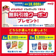 2025年12月31日(水)までのキャンペーン期間内に特設ページにアクセスをして、会員登録をしていない人は会員登録をした上でエントリーをすると、後日抽選で合計10,000名に『明治 果汁グミ or 明治ヨーグルト各種 サンドラッグ無料引換券』が当たる、プレゼントキャンペーンとなっています。