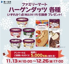 2025年12月26日(金)17時までのキャンペーン期間内に、LINE友だちに追加をした上でアンケートに回答をすると、後日抽選で5,000名に『ハーゲンダッツ 7種から1つ ファミリーマート無料引換券』が当たる、プレゼントキャンペーンとなっています。