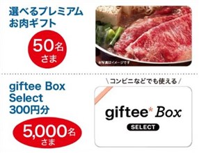 2026年1月15日(木)までのキャンペーン期間内に、LINE友だちに追加をした上でトーク画面の応募先からアンケートに回答をして応募をすると、その場で抽選で合計5,055名に『giftee Box SELECT 300円分』が当たる、プレゼントキャンペーンとなっています。
