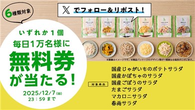 2025年12月7日(日)までの期間中に、ローソン公式アカウントをフォローして、毎日投稿される対象ポストをリポストすると、その場で抽選で毎日10,000名・期間中合計50,000名にその場で『対象のローソンオリジナルパウチサラダ 無料引換券』が当たる、プレゼントキャンペーンとなっています。