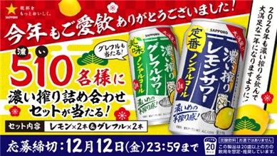 2025年12月12日(金)までのキャンペーン期間中に、公式アカウントをフォローして、キャンペーン期間中に投稿される対象ポストをリポストすると、後日抽選で510名に『サッポロ 濃いめのノンアルコール2本 + 濃い搾りグレフルサワーノンアルコール2本』が当たる、プレゼントキャンペーンとなっています。