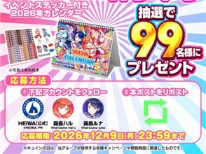2025年12月9日(火)までのキャンペーン期間内に、3つの公式アカウントをフォローした上で、キャンペーン期間中に投稿される対象ポストをリポストすると、後日抽選で99名に『ハルルナカレンダー2026』が当たる、プレゼントキャンペーンとなっています。